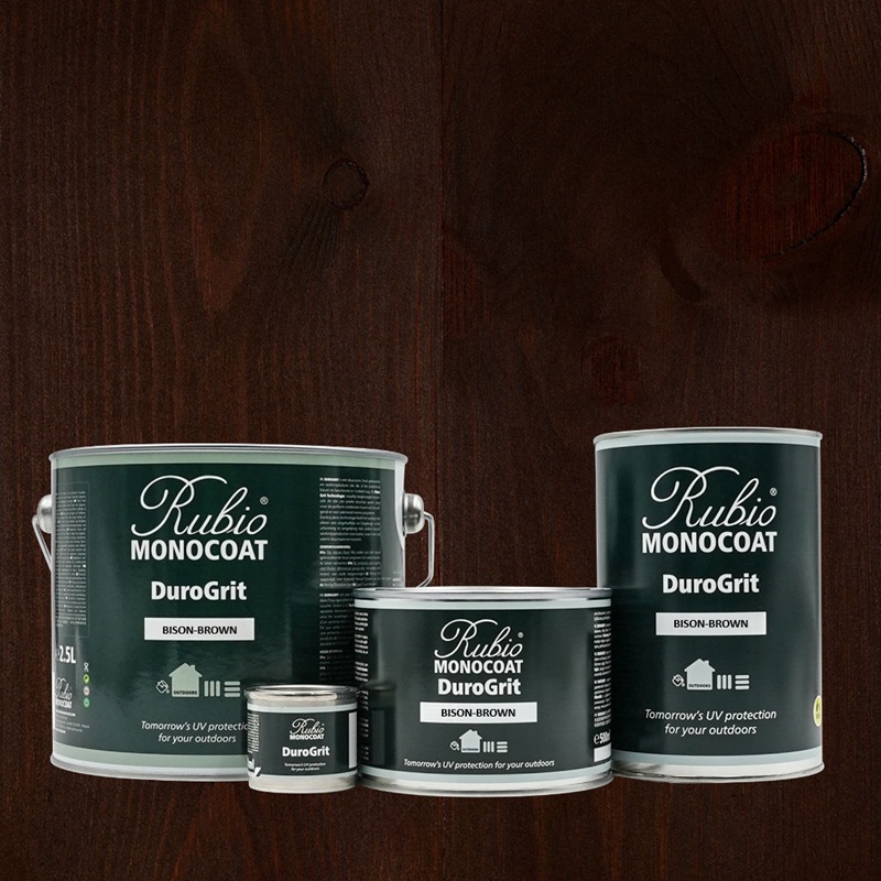 Rubio Monocoat DuroGrit Bison Brown is perfect voor houtprojecten buitenshuis, waar goede uv-bescherming en een lange levensduur essentieel zijn. Het product is verkrijgbaar in 14 kleuren en is geschikt voor de behandeling van terrassen, tuinmeubelen, gevelbekleding, enz. Dankzij het 0% VOS-gehalte is het bovendien milieuvriendelijk en veilig in gebruik.
