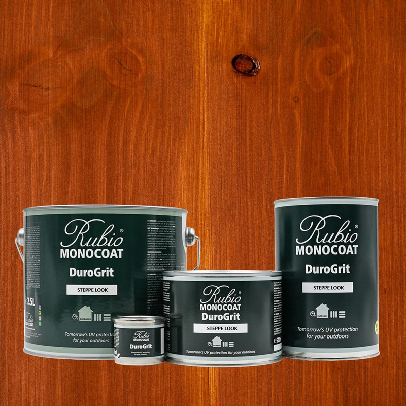 Rubio Monocoat DuroGrit Steppe Look is perfect voor houtprojecten buitenshuis, waar goede uv-bescherming en een lange levensduur essentieel zijn. Het product is verkrijgbaar in 14 kleuren en is geschikt voor de behandeling van terrassen, tuinmeubelen, gevelbekleding, enz. Dankzij het 0% VOS-gehalte is het bovendien milieuvriendelijk en veilig in gebruik.
